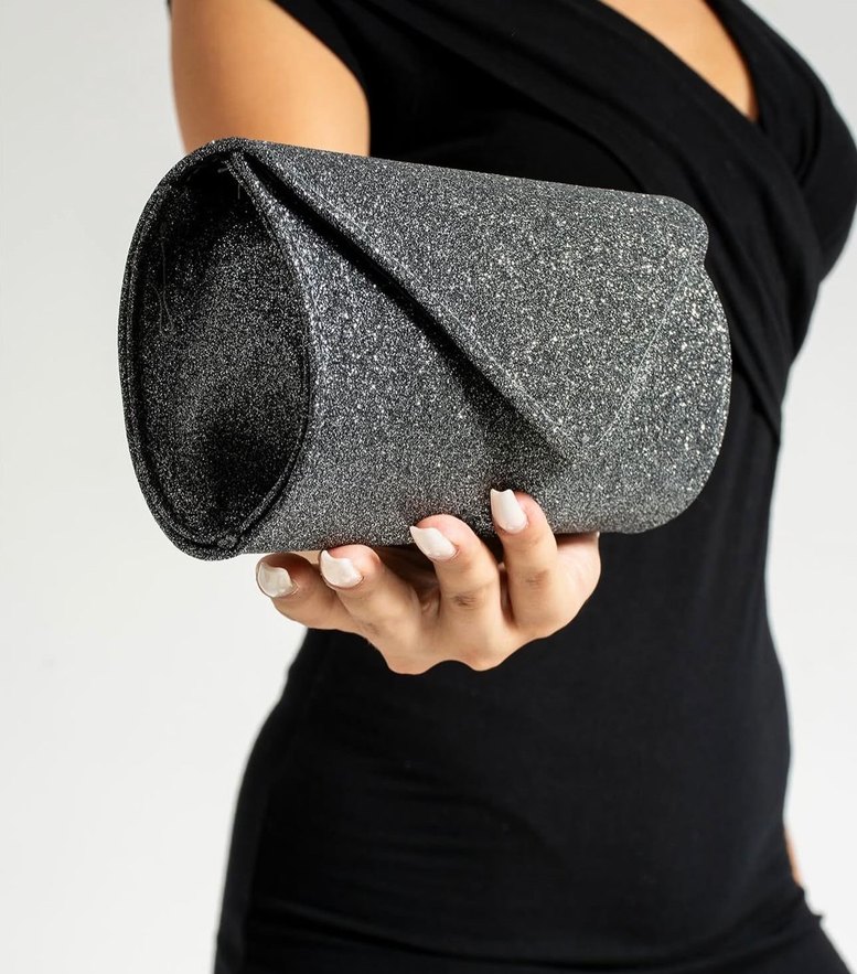 Gri simli sentetik kumaştan yapılmış, desen içermeyen, çağdaş tasarımlı kadın abiye portföy çanta. Parti için uygun, şık ve modaya uygun.✨