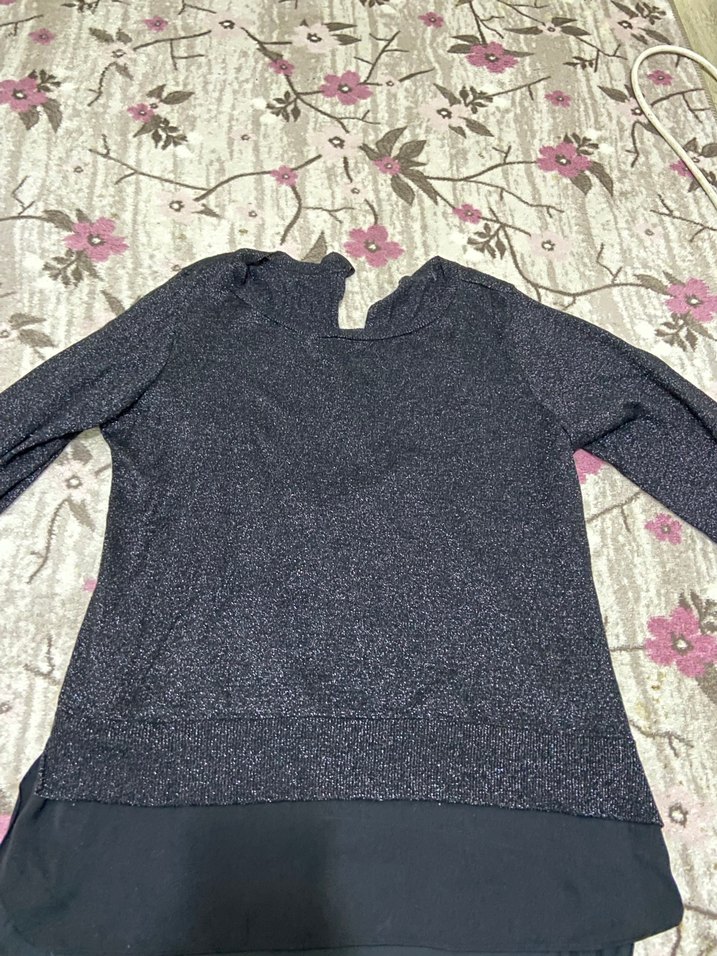 Gri renkte, uzun kollu, yuvarlak yakalı ve bol kesim kadın triko sweatshirt. Yumuşak sentetik kumaştan örülmüş, midi uzunlukta, günlük sokak tarzı için uygun simli parıltılı.
