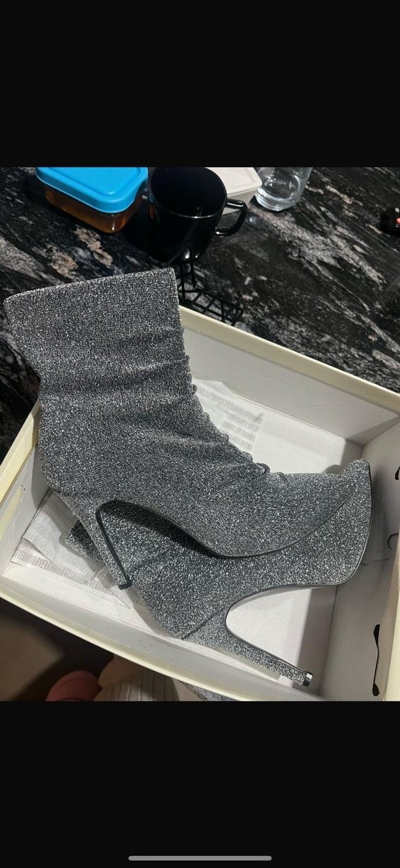 Gri renkte, simli yüzeyli ve yılan derisi desenli stiletto topuklu kadın botu. Sentetik kumaştan üretilmiş, günlük kullanıma uygun çağdaş tarzda. ✨
