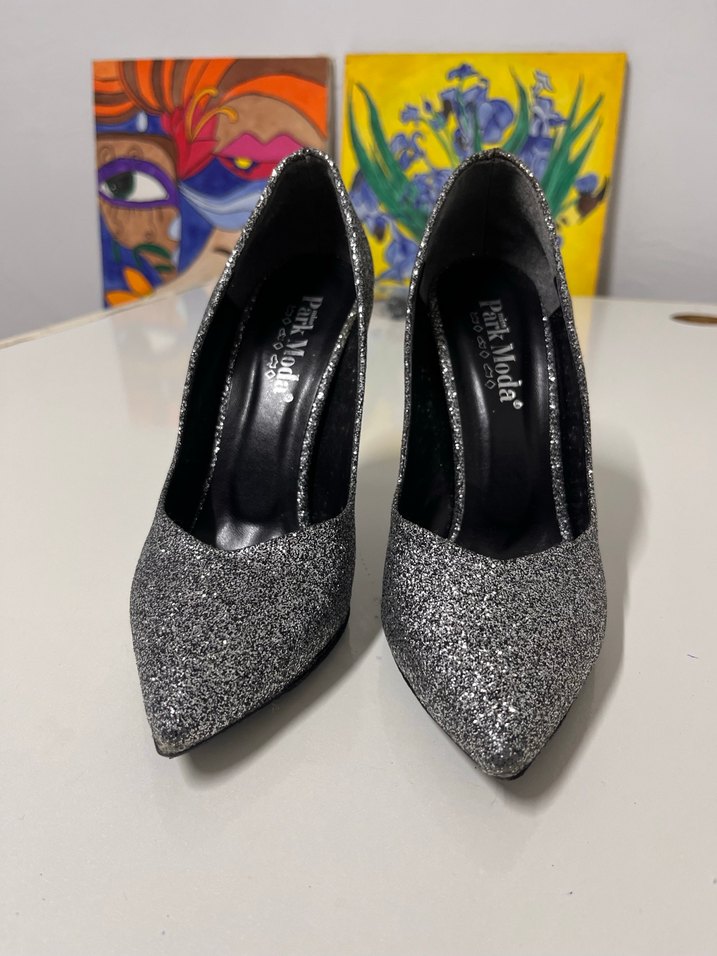 Gri simli ve yılan desenli, kauçuk malzemeden yapılmış stiletto topuklu abiye ayakkabılar, partiler için şık bir tercih. ✨