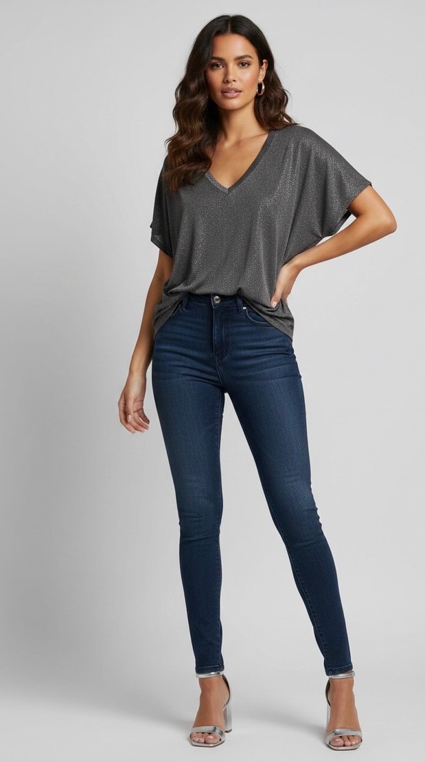 Gri simli V Yakalı Kadın Bluz