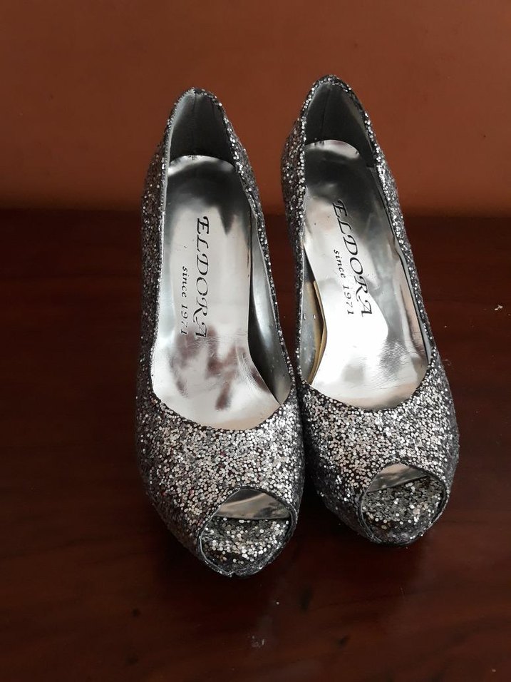 Gri yılan desenli ve simli yüksek topuklu abiye ayakkabılar, metal malzemeden üretilmiştir. Düğün ve özel geceler için uygundur. EL.DOR markalıdır. ✨