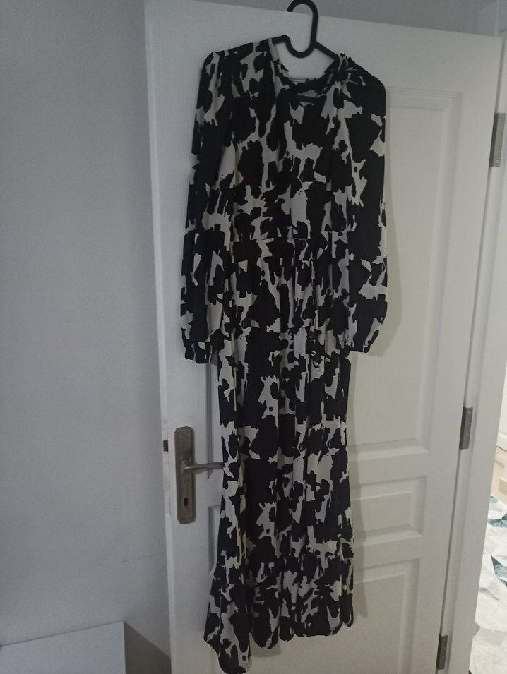 Salaş kesim, drapeli uzun elbise, uzun kollu ve V yakalı. Gri-siyah bağlama desenli, yumuşak sentetik kumaştan, sokak stili için uygun.