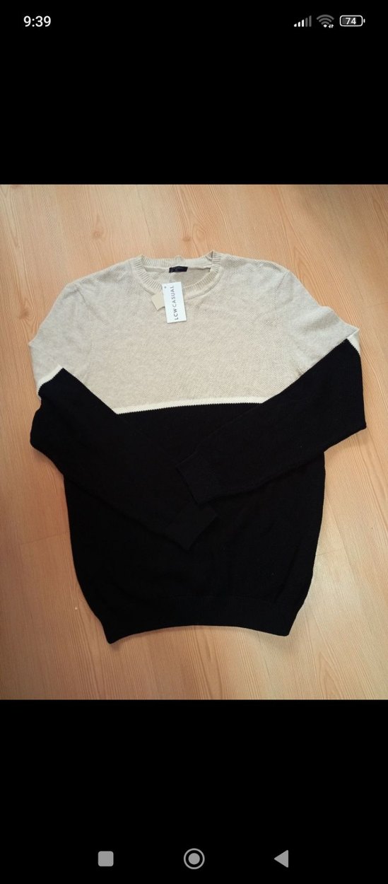 Gri ve siyah renk bloklu, bisiklet yaka ve uzun kollu erkek triko. Pamuklu, düzenli kesim, günlük kullanım için uygundur.