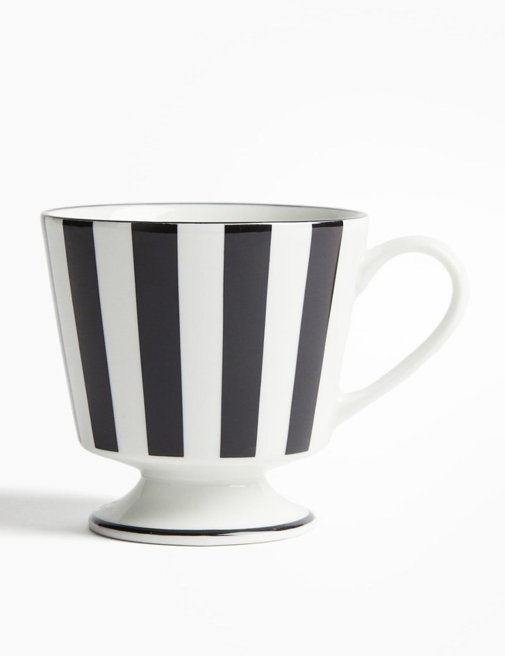 Beyaz ayaklı kupa, dikey gri ve siyah çizgilerle şık bir görünüm sunar ☕.