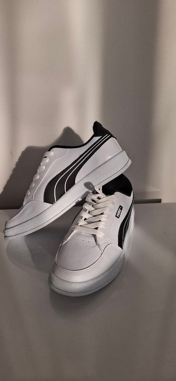 Gri siyah çizgili detaylara sahip beyaz spor ayakkabılar, blok topuk ve kolay kullanım için cırt cırtlıdır. Spor tarzı için uygundur.