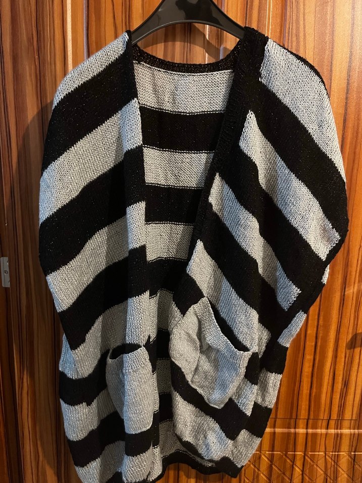 Gri ve siyah çizgili, uzun kollu, salaş kesim kadın triko hırka. Tekne yaka ve midi uzunlukta, rahat ve bohem tarzda bir parça. El işi kadın l xl uyumlu yelek