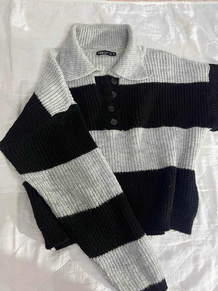 Örgü kumaştan, uzun kollu, yakalı, gri siyah çizgili ve bol kesim kadın kazak. Rahat ve şık bir sokak tarzı parçası. Hiç giyilmedi standart beden.