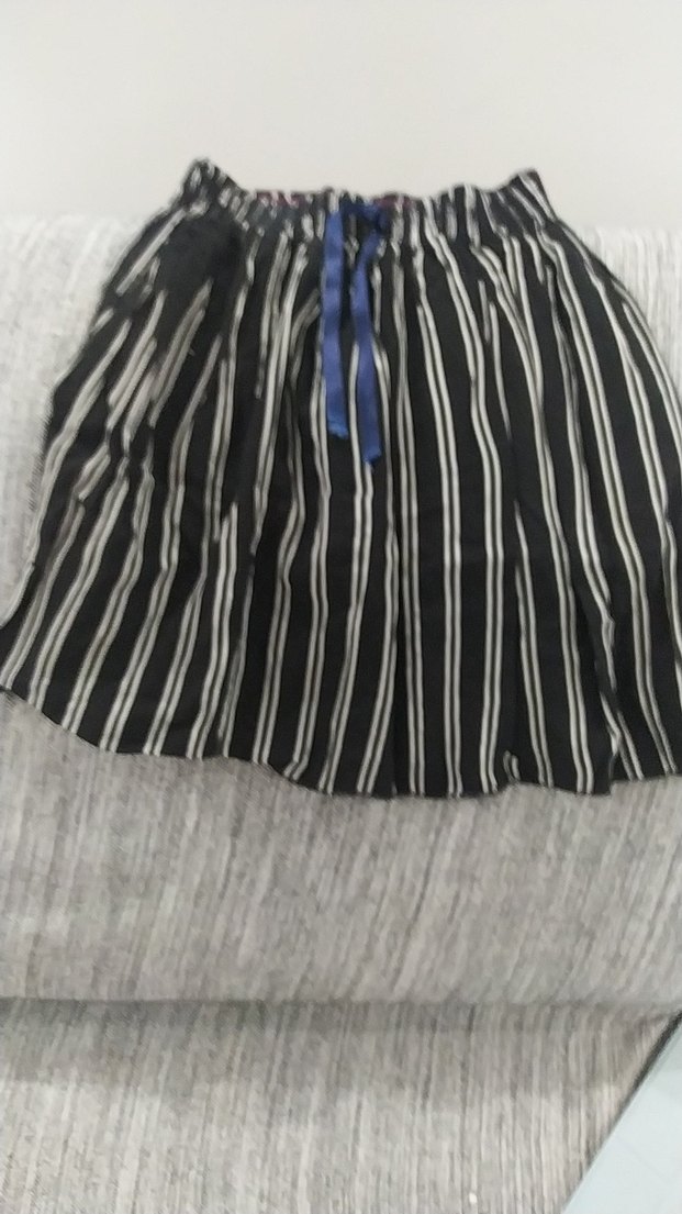 Gri siyah çizgili, pilili ve bol kesim mini etek. Yumuşak sentetik kumaştan günlük rahat kullanım için uygundur.