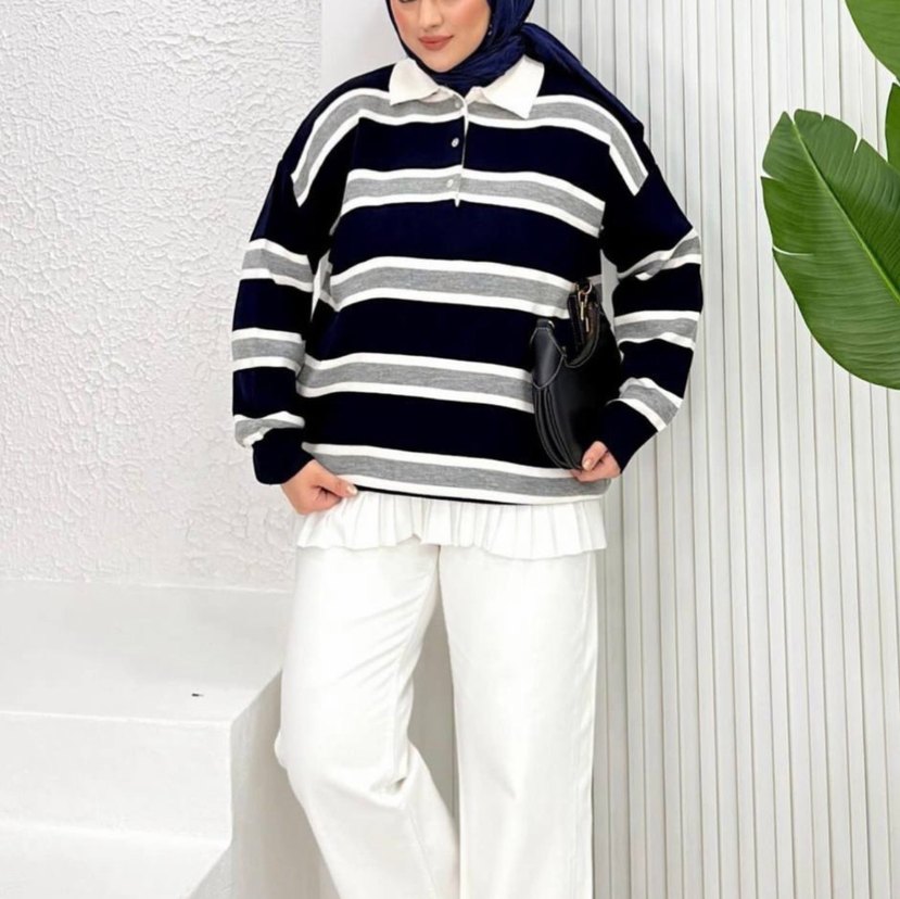 Gri Siyah Çizgili Salaş Bisiklet Yaka Kazak