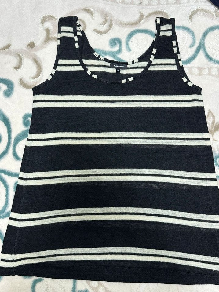 Gri siyah yatay çizgili, triko dokuma, kayık yaka ve kolsuz kadın atlet. Rahat kesimli, midi boyda, günlük sokak stiline uygun.