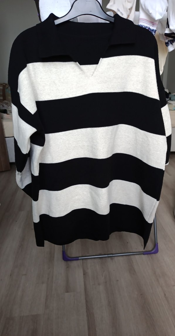 Bol kesim, uzun kollu, yuvarlak yaka kadın kazak. Geniş gri ve siyah çizgilerle örülmüş, yumuşak sentetik kumaştan rahat bir sokak stili sunar. Günlük kullanıma uygun.