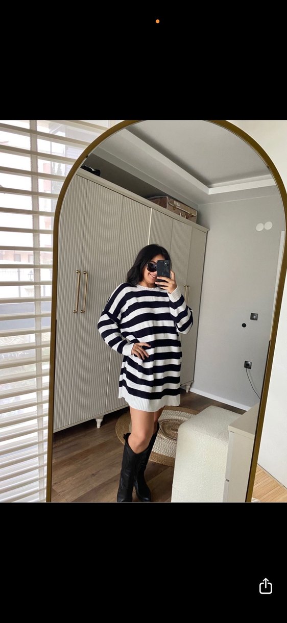 Gri ve siyah çizgili, yüksek yakalı, uzun kollu, rahat kesim midi örgü triko kazak. Günlük sokak stili için uygundur.