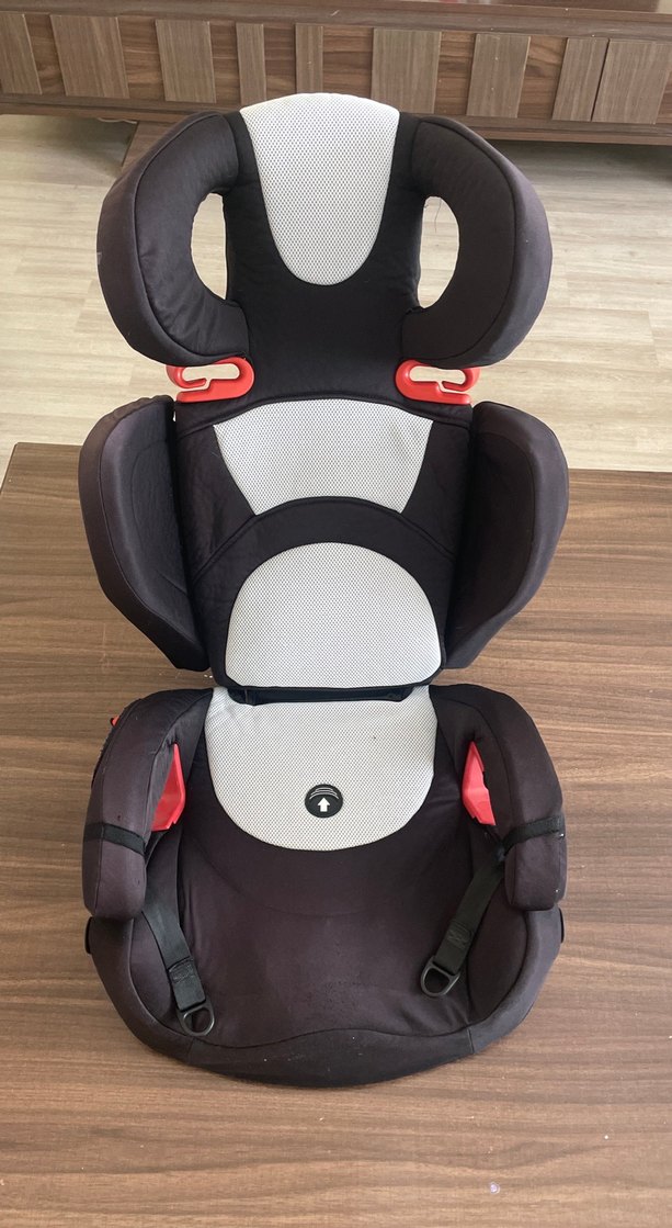 Gri ve siyah renklerde çocuk araba koltuğu, yastıklı yan destekler ve emniyet kemerleri ile güvenli oturuş sağlar. Kırmızı ayar klipsleri bulunur. 3-6 yaş için sırt tarafı komple çıkıyor sadece alt destekte kullanınlabilir.