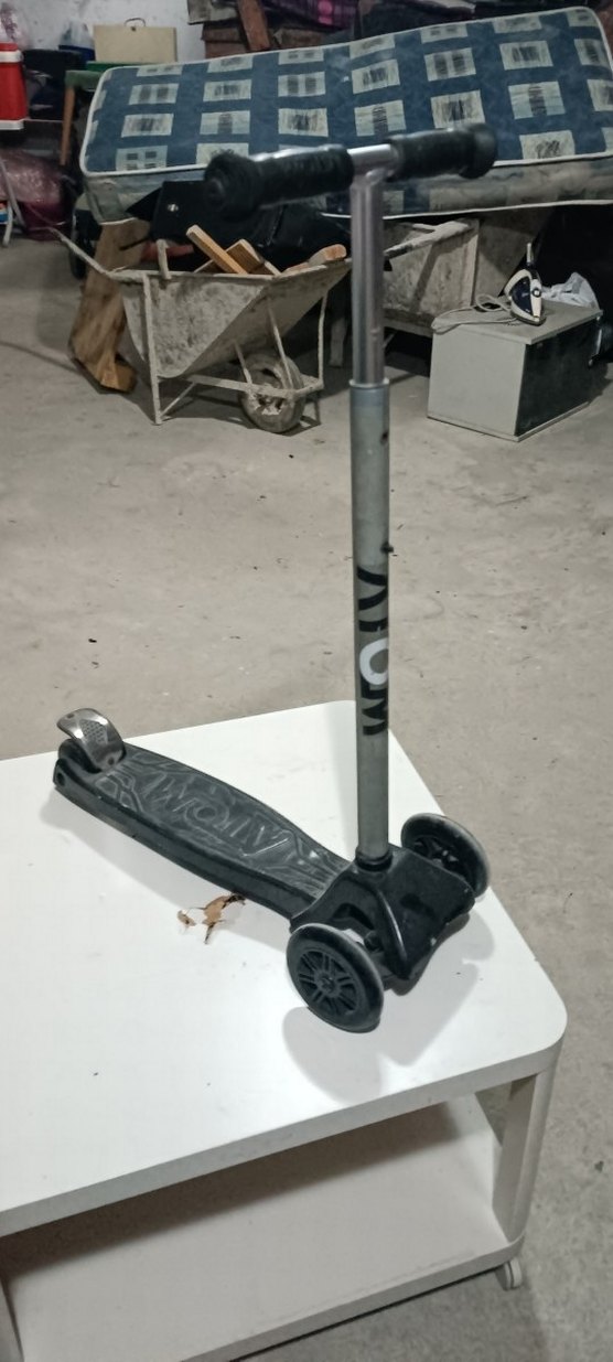 Gri ve siyah renkte, üç tekerlekli, sağlam ve tutuşu rahat çocuk scooterı.