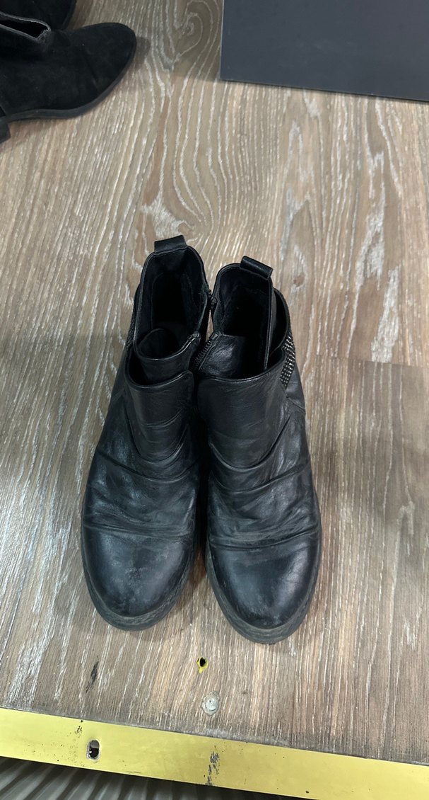 Gri siyah deri kadın botları, dolgu topuklu ve tokalı detaylara sahiptir. Goth ve grunge punk tarzına uygun, günlük kullanım için şık bir model.