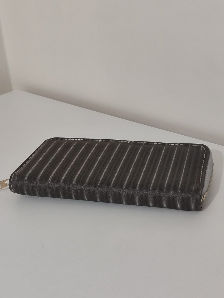 Gri ve siyah deri, pliseli ve çizgili desene sahip kadın cüzdanı, günlük iş kullanımı için çağdaş bir tarz sunar.