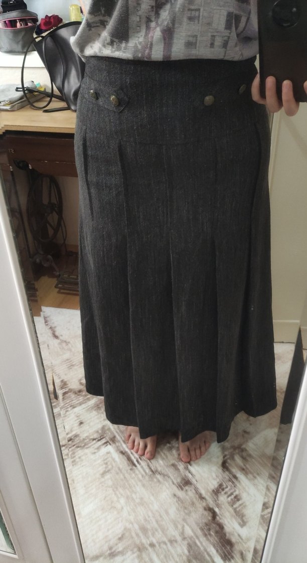 Gri siyah renk, keten kumaştan uzun pilili ve bol kesim etek. Sade tasarımı gotik stile ve ofis kullanıma uygundur. kışlık kalındır.