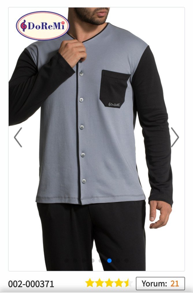 Düğmeli, bisiklet yaka ve uzun kollu erkek pijama takımı. Gri ve siyah renklerin kullanıldığı, normal kesim ve cep detaylı rahat tasarım.
