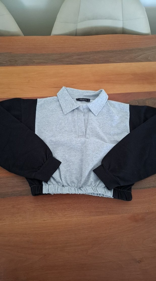 Kadın sweatshirt, siyah uzun kollu ve gri gövdeye sahip. Yaka ve düğme detayı bulunur. Bol kesim, lastikli etek ucu ve bisiklet yaka ile rahat sokak stili için uygun.