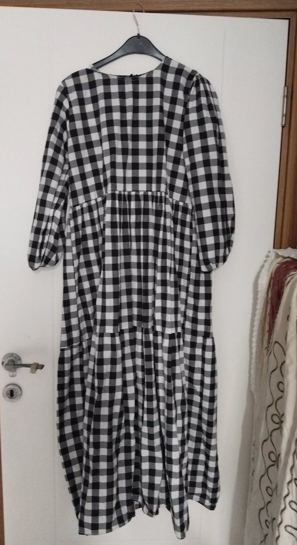 Gri siyah ekose desenli, pilili, uzun ve bol kesim elbise. Kayık yaka ve uzun kollu, günlük rahat kullanım için uygundur.