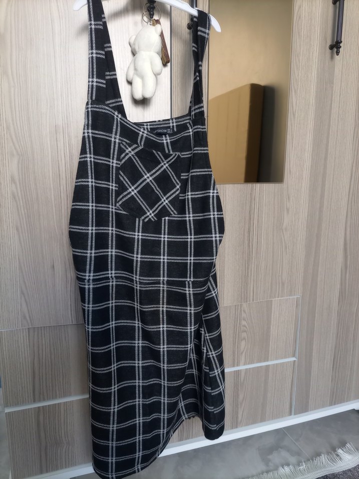 Gri ve siyah ekose desene sahip elbise, ön cepli. marka temsilidir