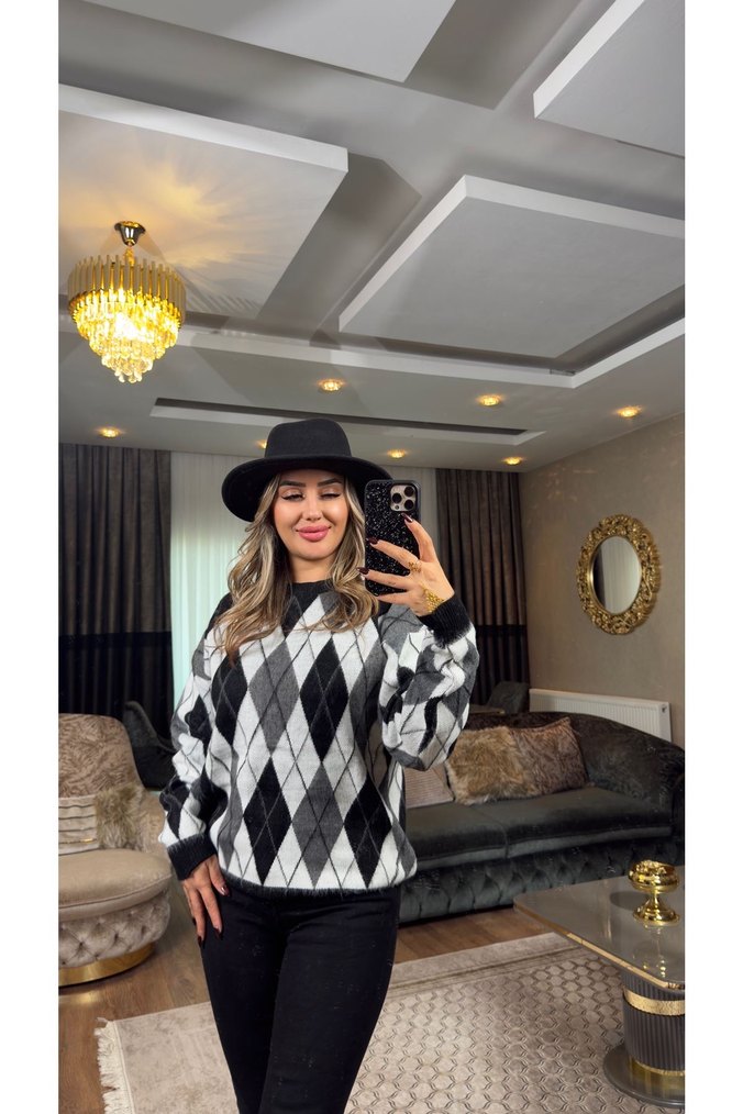 Gri Siyah Geometrik Desenli baklava Kadın Kazak