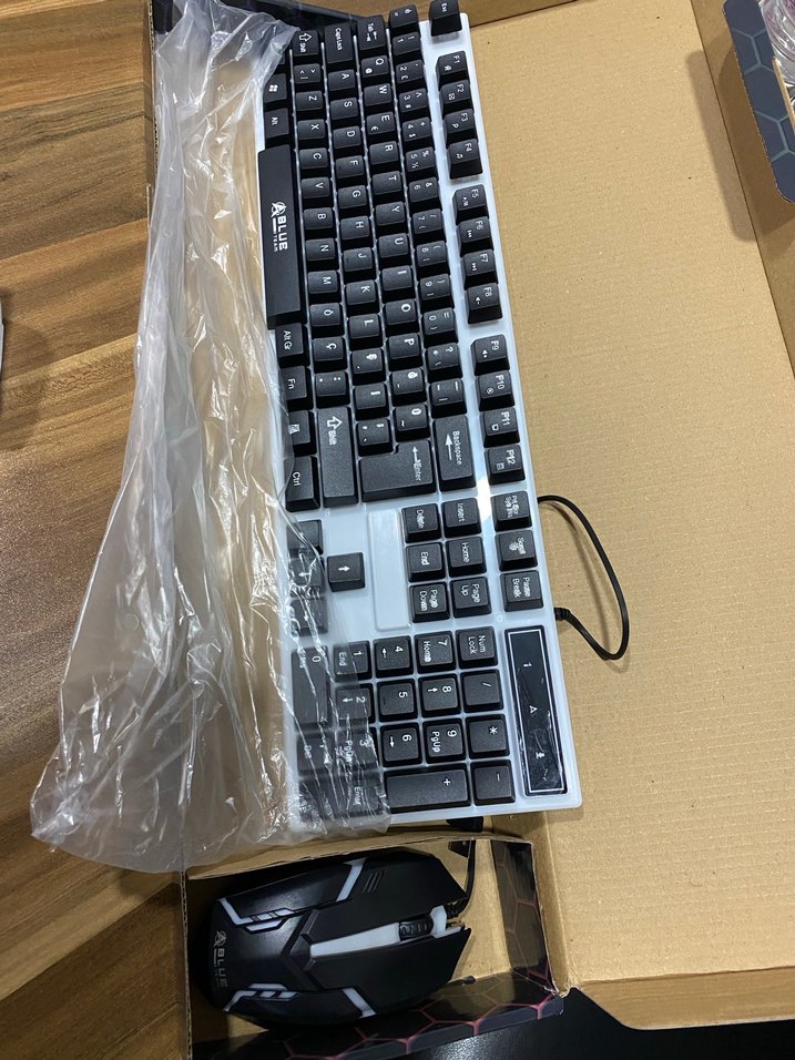 Gri taban üzerine siyah tuşlarla tam düzen klavye ve şık siyah tasarımlı fare seti, kablolu bağlantıya sahiptir. ️