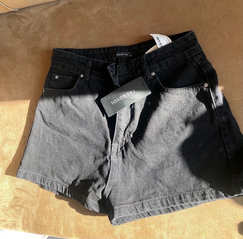 Kadınlar için gri siyah tonlarında, bol kesim denim mini şort. Günlük kullanım ve sokak modası için rahat ve şık. Etiketi hala var.