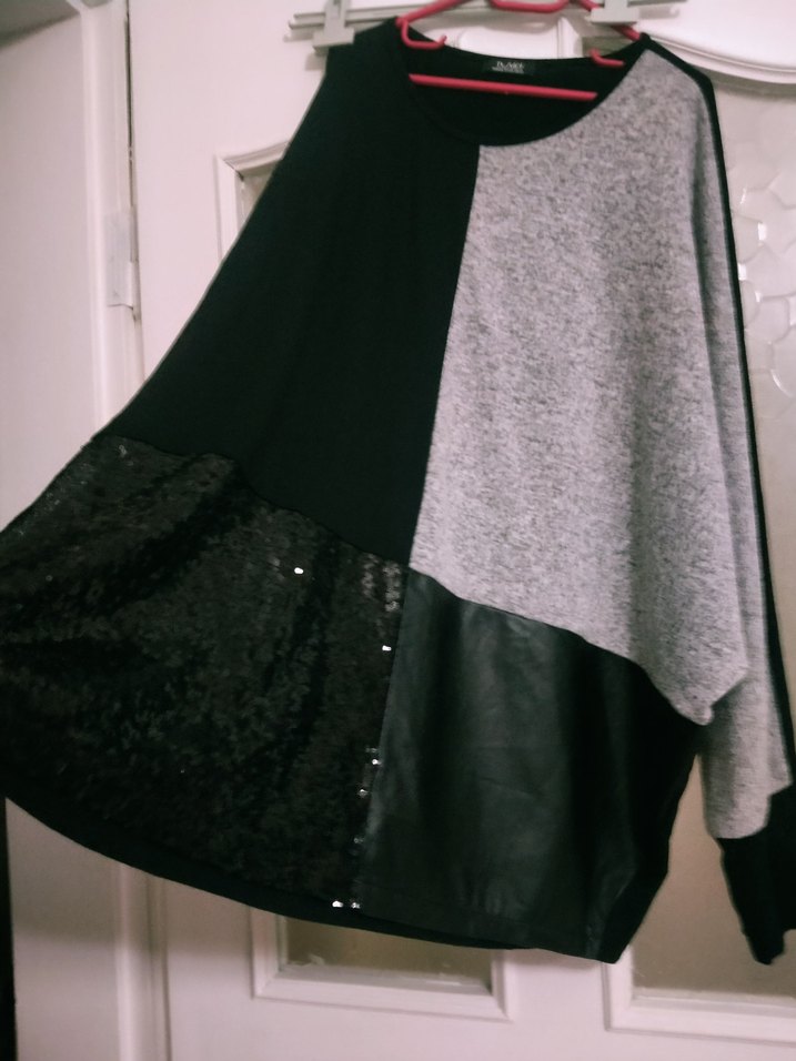 Gri ve siyah renklerde, uzun kollu, salaş kesim kadın tunik. Drapeli tasarım, yumuşak sentetik kumaş ve parlak detaylar içerir. Rahat goth tarzıyla günlük kullanım için uygundur. tuvid marka büyük beden.en 75 boy 85.