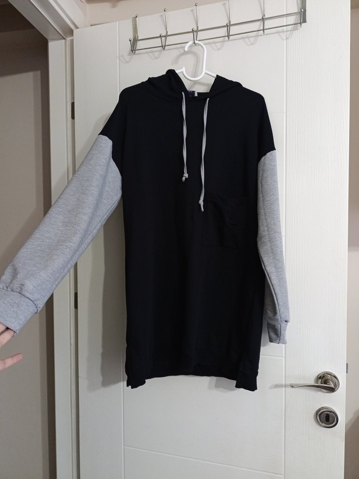 Kadınlar için uzun kollu, gri ve siyah renkli kapüşonlu sweatshirt. Yüksek yakalı, bol kesim ve yırtmaç detaylı, yumuşak ve sıcak kumaştan üretilmiştir.