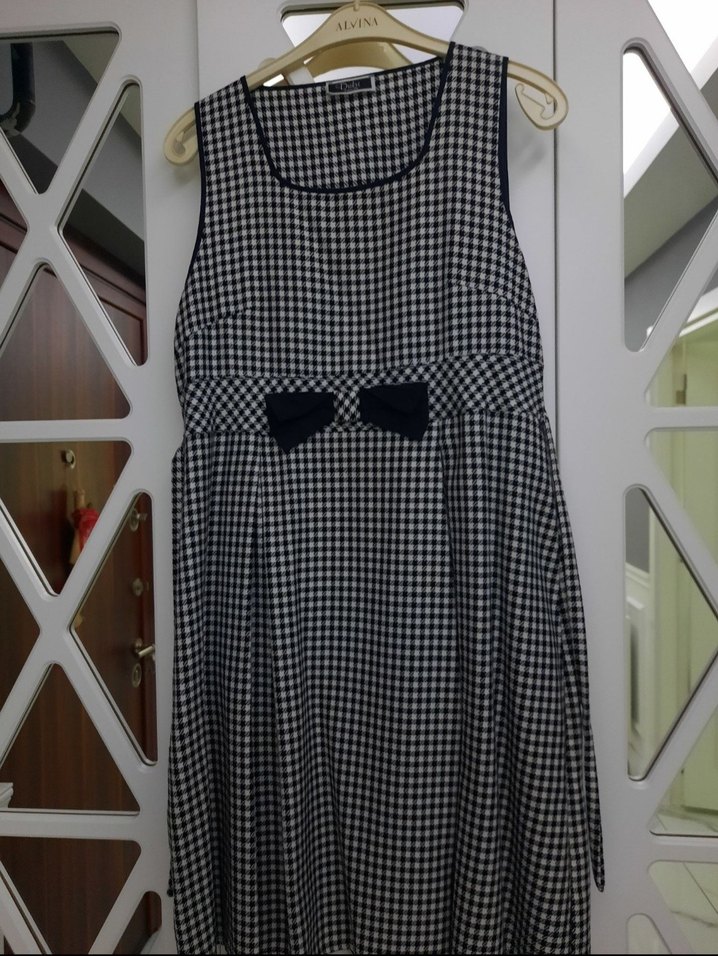 Kareli desende, pileli etekli ve fiyonk detaylı, kolsuz midi hamile elbisesi. Rahat kesimli ve yuvarlak yakalı, yumuşak sentetik kumaştan üretilmiştir.