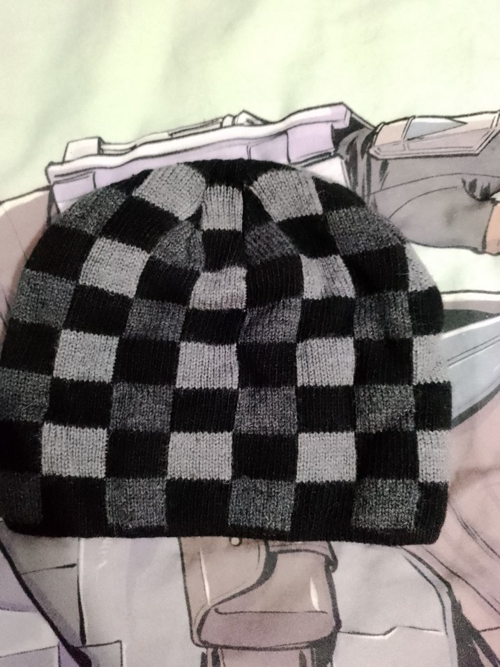 Gri ve siyah triko kareli desene sahip erkek çocuk bere, 6-7 yaş için uygundur.