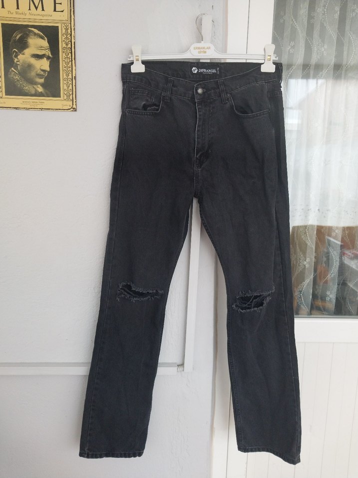 Siyah kot pantolon, dizlerde kesik detaylı, midi boy ve salaş kesim. Günlük kullanım için rahat ve sokak stili uyumlu.arka paça kısmında dokuma hatası var. sökük değil