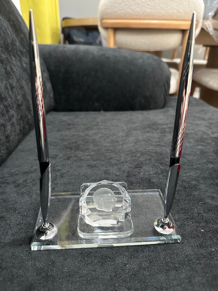 Gri ve siyah tonlarda, şeffaf taban üzerinde iki şık gümüş kalem ve ortasında dekoratif kristal detay bulunan masaüstü kalemlik. Anıtkabir hediye dükkanından alınmış olup hediye gelmiştir fakat kullanılmadığından ihtiyaç fazlasıdır.