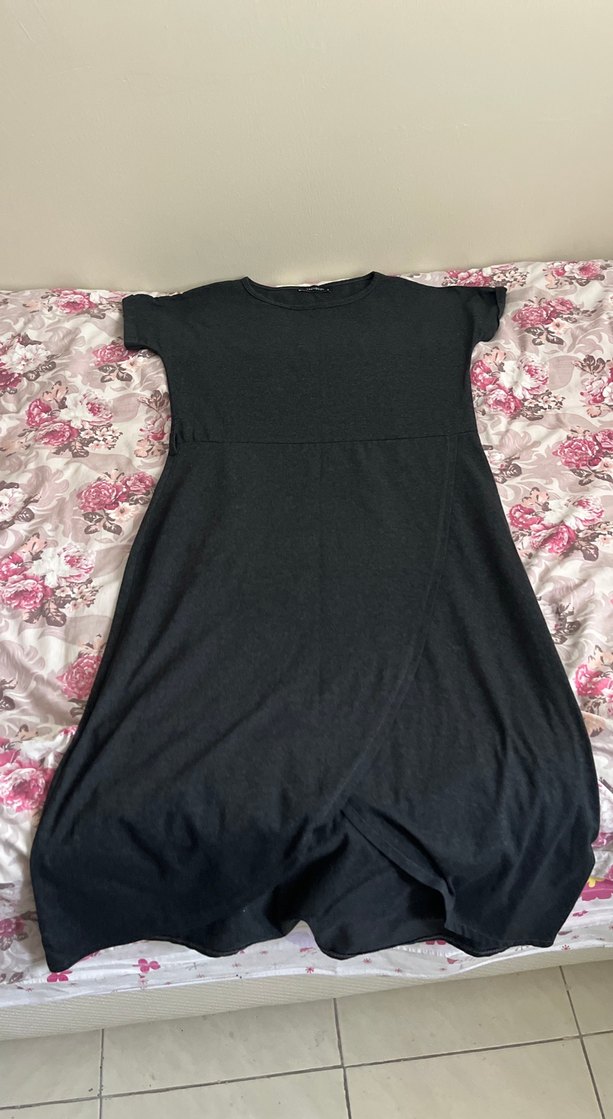 Gri siyah renklerde, kısa kollu, drapeli ve bol kesim midi elbise. Yumuşak sentetik kumaştan, günlük kullanım için uygundur.