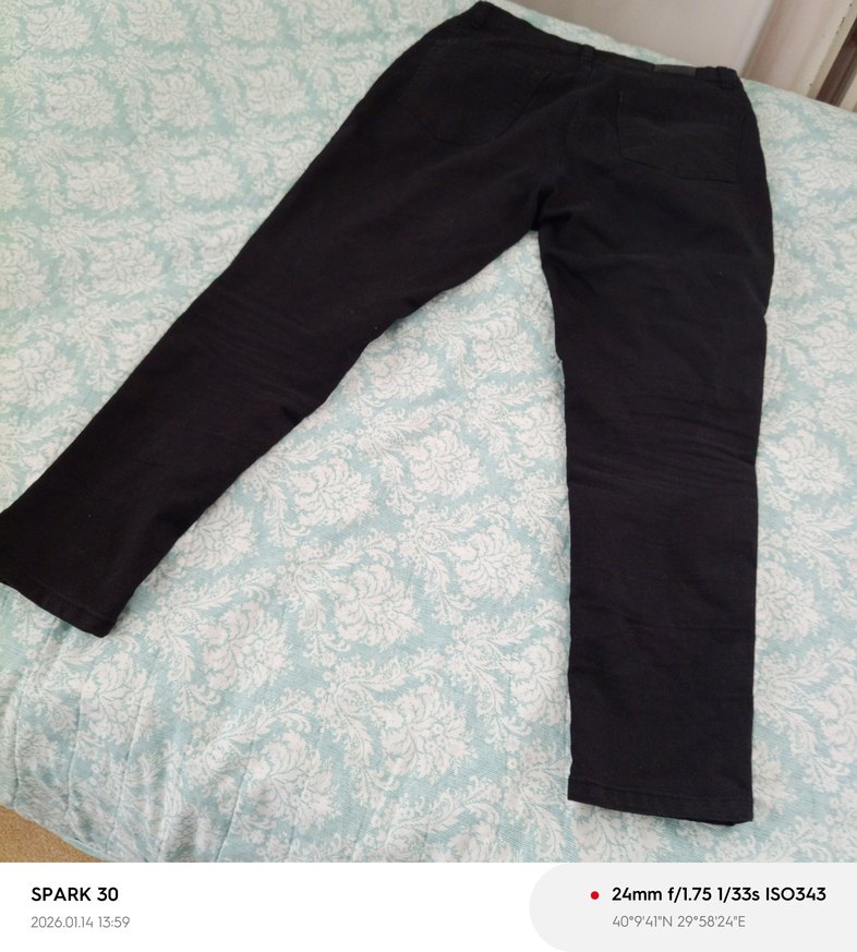 Gri-siyah renkte, midi boyda, bol kesim kot pantolon. Rahat kullanım için yanlarda yırtmaç detaylıdır.