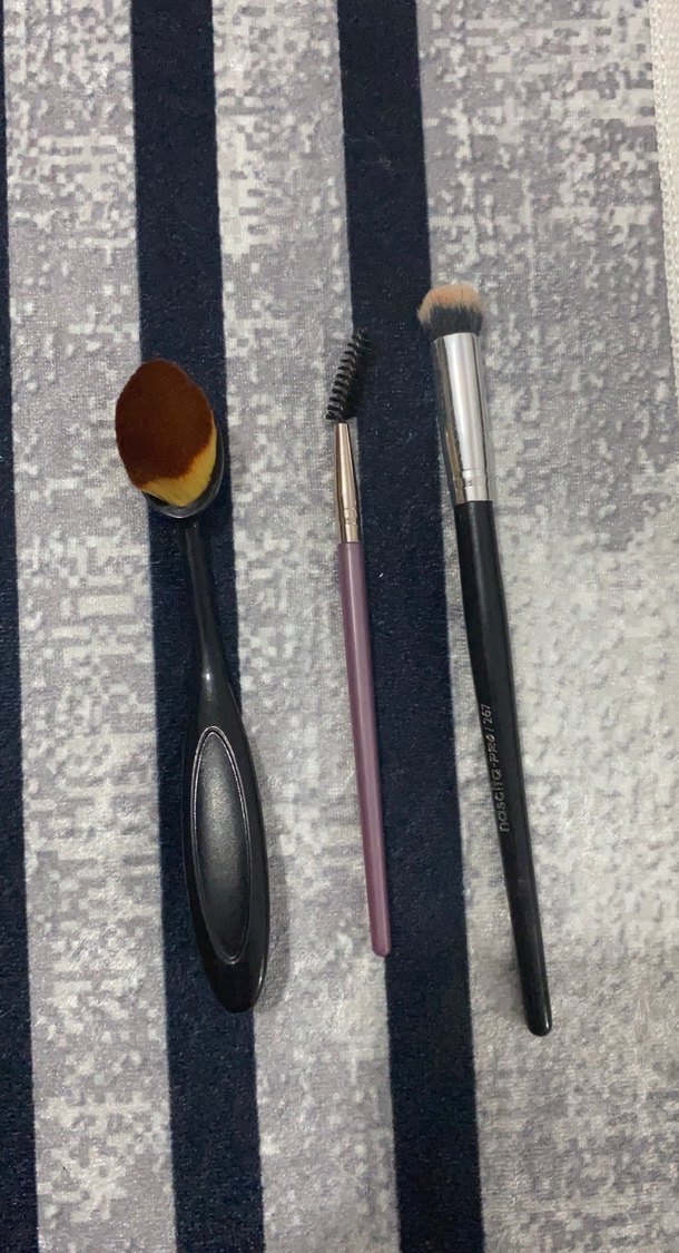 Yoğun oval fırça, spoolie ve küçük açılı fırçadan oluşan koyu gri saplı 3 parçalı makyaj fırçası seti. ️