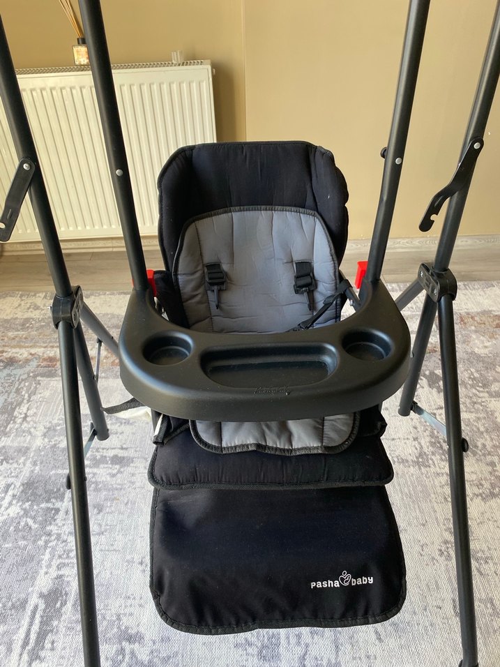 Pasha Baby marka, gri dolgulu oturma alanı ve güvenlik kemeriyle siyah mama sandalyesi. Bardak tutuculu tepsisi bulunur. Çok az kışladım hem beşik hem mama sandalyesi hemde salıncak