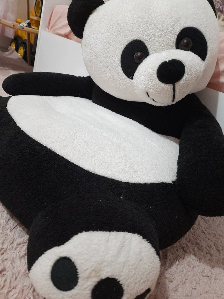 Gri ve siyah renklerde yumuşak peluş panda oyuncak, sarılmak için büyük ve sevimli tasarıma sahip. baş kısmında mavi leke var. Ben çıkaramadım.