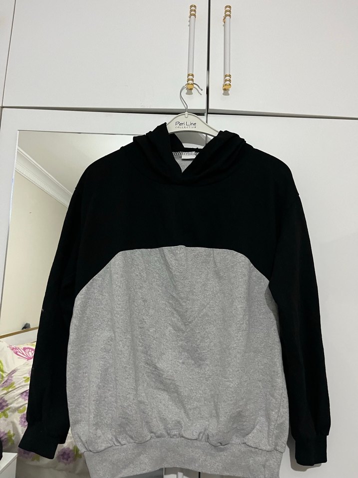 Uzun kollu, kapüşonlu, gri ve siyah renk bloklu kadın sweatshirtü. Yumuşak ve sıcak dokusu ile rahat kullanım sağlar.