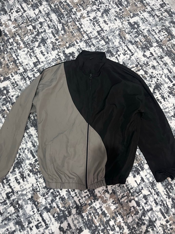 Gri ve siyah renklerde, fermuarlı, yüksek yakalı, bol kesim rüzgarlık. Günlük kullanıma uygun sentetik kumaştan yapılmıştır. ️