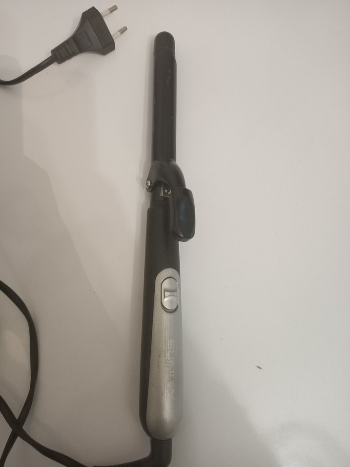 Gri ve siyah renkli saç maşası ince varil ve kolay kullanım için klips içerir. Açma/kapama düğmesi ve fişli kabloya sahiptir. ♀️