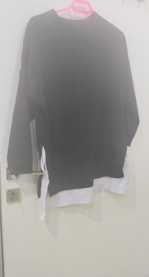 Yuvarlak yaka, uzun kollu ve salaş kesim gri siyah kadın sweatshirt. Midi boyda, dökümlü tasarımıyla sokak stiline uygun, sentetik kumaştan üretilmiştir.