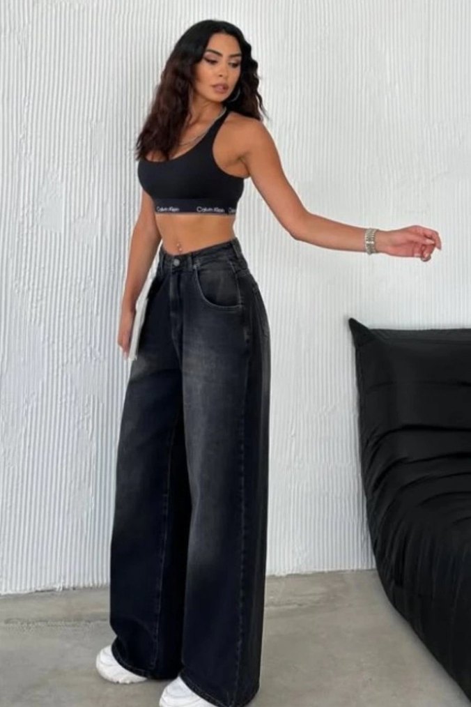 Gri siyah renkte, salaş kesim midi boy kot pantolon, rahat ve şık bir görünüm sunar. Günlük sokak stili için uygundur. aşırı az giyildi