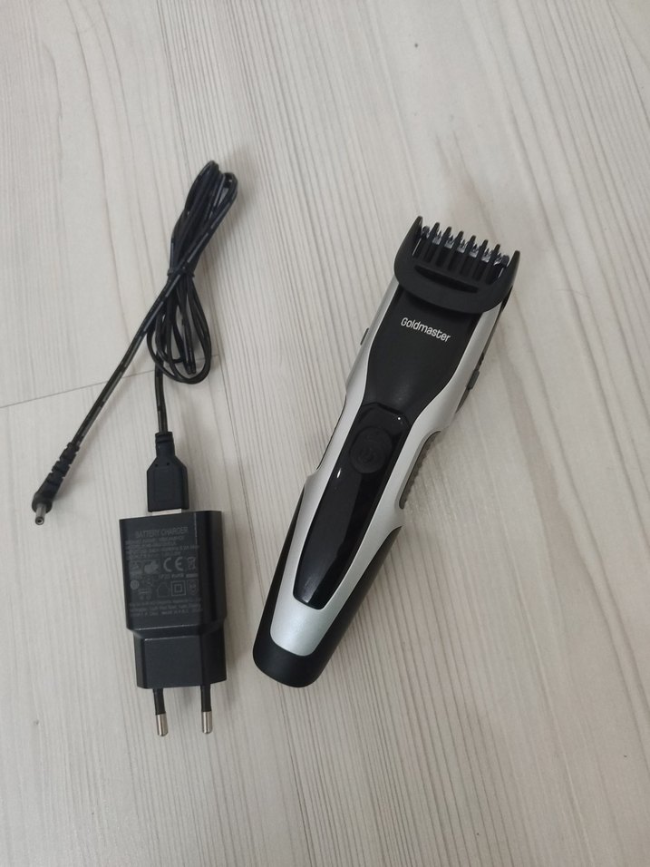 Ayarlanabilir taraklı gri-siyah şarjlı saç kesme makinesi ve şarj adaptörü dahildir. Hassas kesim ve bakım için uygundur. ✂️