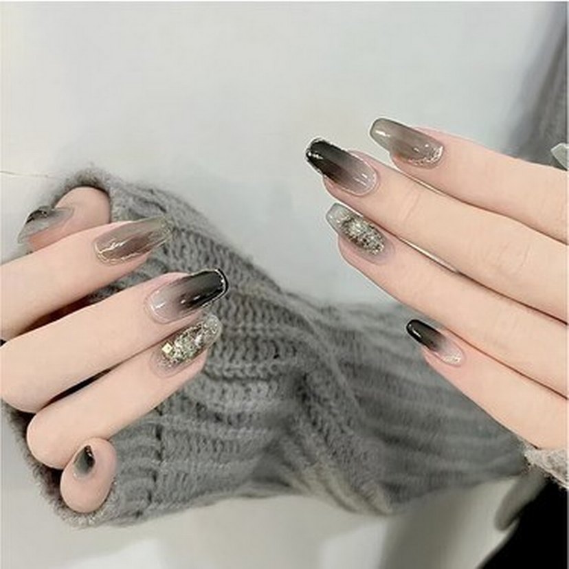 Gri tonlarda geçişli ve simli detaylara sahip şık tırnak süslemeleri. Tırnaklarınıza zarif bir parlaklık katmak için ideal.