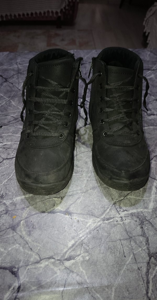 Siyah, tokalı ve bağcıklı erkek goth botları, kauçuk malzemeden yapılmış. Gri tonlarda, desensiz ve günlük kullanım için uygun grunge punk tarzında.