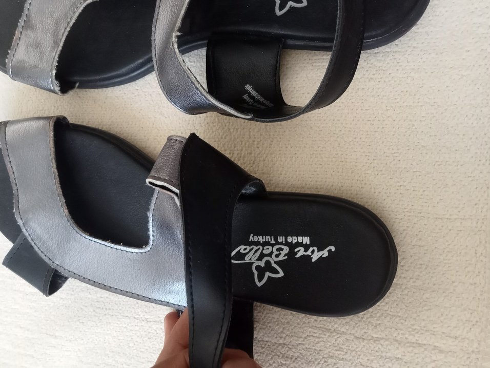 Gri ve siyah renkte, tokalı kayışlara sahip baskılı kauçuk kadın terlik, günlük sokak giyimine uygun.