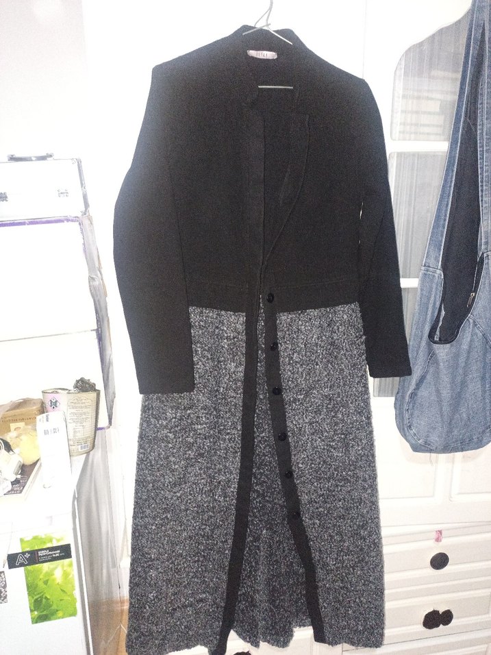 Gri siyah renkli ve uzun kollu, kadın kaşe buklet kaban. koltukaltı 50 cm, boyu 130,5 cm. gizli düğmeli, arkası yırtmaçlı kaşe kaban. kumaş bilgileri etiketini fotoğrafını koydum. üstü siyah kaşe, alt kısmı gri buklet diye geçiyor. son 2 fotoğrafta önden üstten 6. düğmenin hizasında arkaya drnk gelen tarafta kumaşta açılma olmuş gibi, açılmadan dolayı dikmiş olabiliriz emin olamadım. farkedilmiyor gibi de. yırtmaç 35 cm.